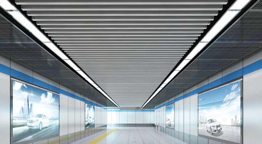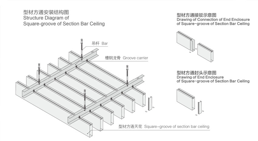 型材方通通過連續(xù)滾壓或冷彎成型,安裝結構為專用龍骨卡扣式結構,安裝方法類似普通的條形扣板,簡單方便,適用于室內裝飾。產品有著開透、吸音和裝飾等功能,并且具備現代時尚、超前效果。通過面板高度、方向以及照明和顏色的變化,將吊頂表現得更加通透和富有動感。