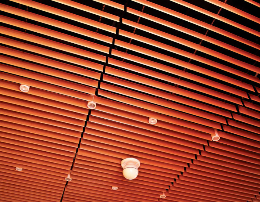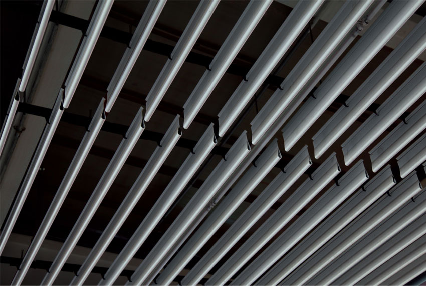 掛片天花采用單向條板安裝,形成單向屏級視覺;線條明快飄逸,選用適當的高度,以適當視覺角度,能產生幕布效果;其維修限制較少,令設計變化萬干,整個建筑空間寬暢通透。